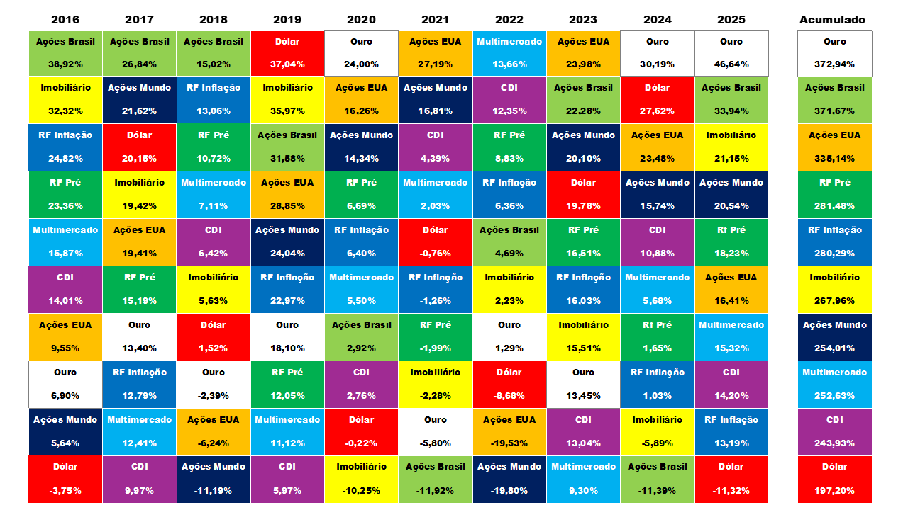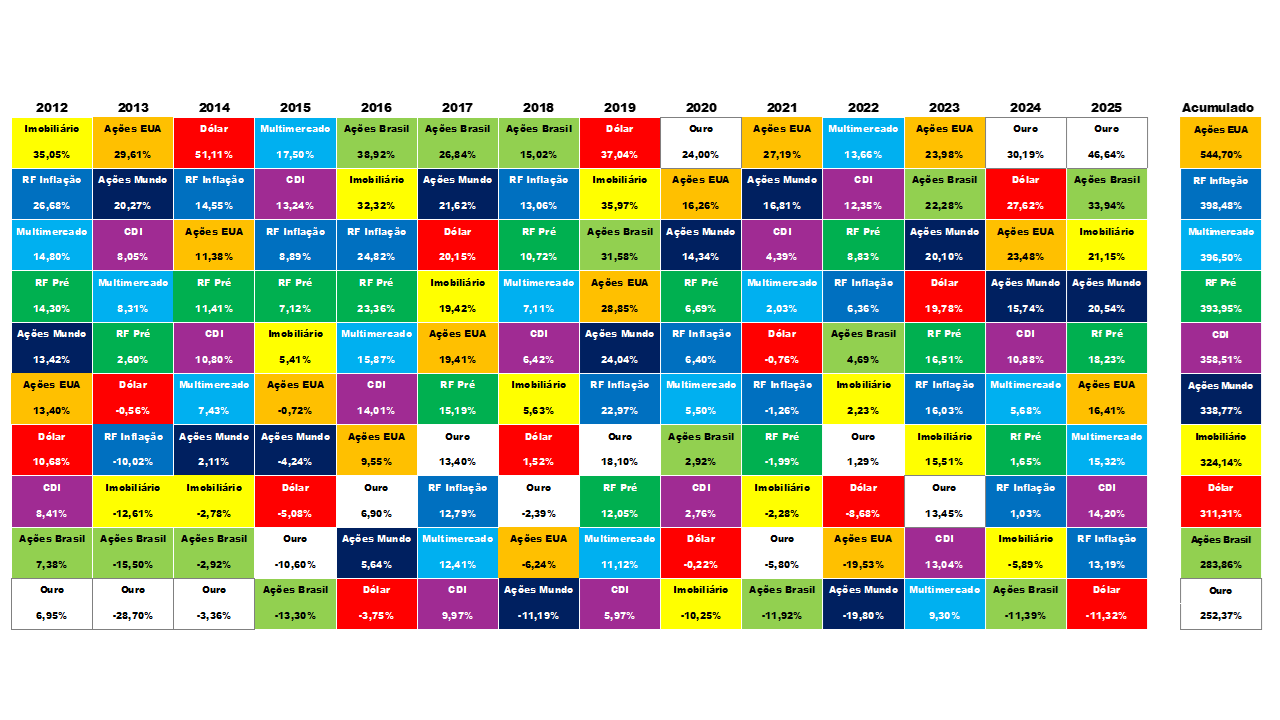 Este material busca ilustrar a importância da diversificação na alocação dos seus recursos em ativos de investimento. Ele deve ser utilizado principalmente para educação financeira dentro de um planejamento financeiro. Esta tabela também serve para demonstrar que não existe hegemonia para se definir o melhor investimento, visto que os mercados são voláteis, ou seja, em determinado momento uma classe de investimentos pode estar indo bem, em outra hora, não.